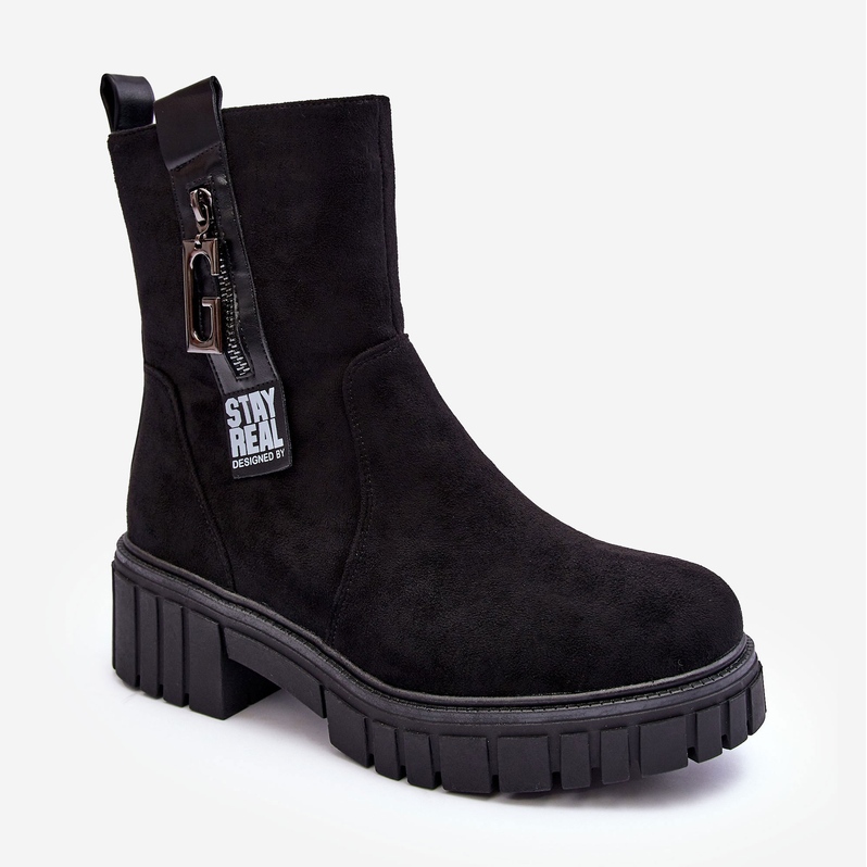 Tyylikkät, mustan mokkanahasta valmistetut mustat saappaat, jotka yhdistävät muodikkaan, massiivisen ilmeen mukavuuteen. Asetettu kiinteälle alustalle ja litteät korkokengät, jotka on eristetty jalkineiden viltillä - täydellinen viileämmälle syksylle ja talvipäiville. Kiinnitetty käytännöllisellä lukolla yläosan sisäpuolelle, pyöristetyllä nenällä mukavuuden vuoksi. Klassinen, yhtenäinen muotoilu toimii monissa jokapäiväisissä ja rento tyylissä.