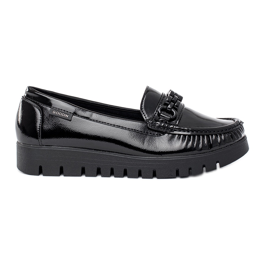 Löydä uusin malli lakattuista naisten puolikerroksista Goodinista, joissa yhdistyvät mukavuus ja moderni muotoilu. Nämä tyylikkäät mustat kengät paksulla pohjalla ovat täydellinen täydennys jokaiselle päivittäiselle tyylistä.