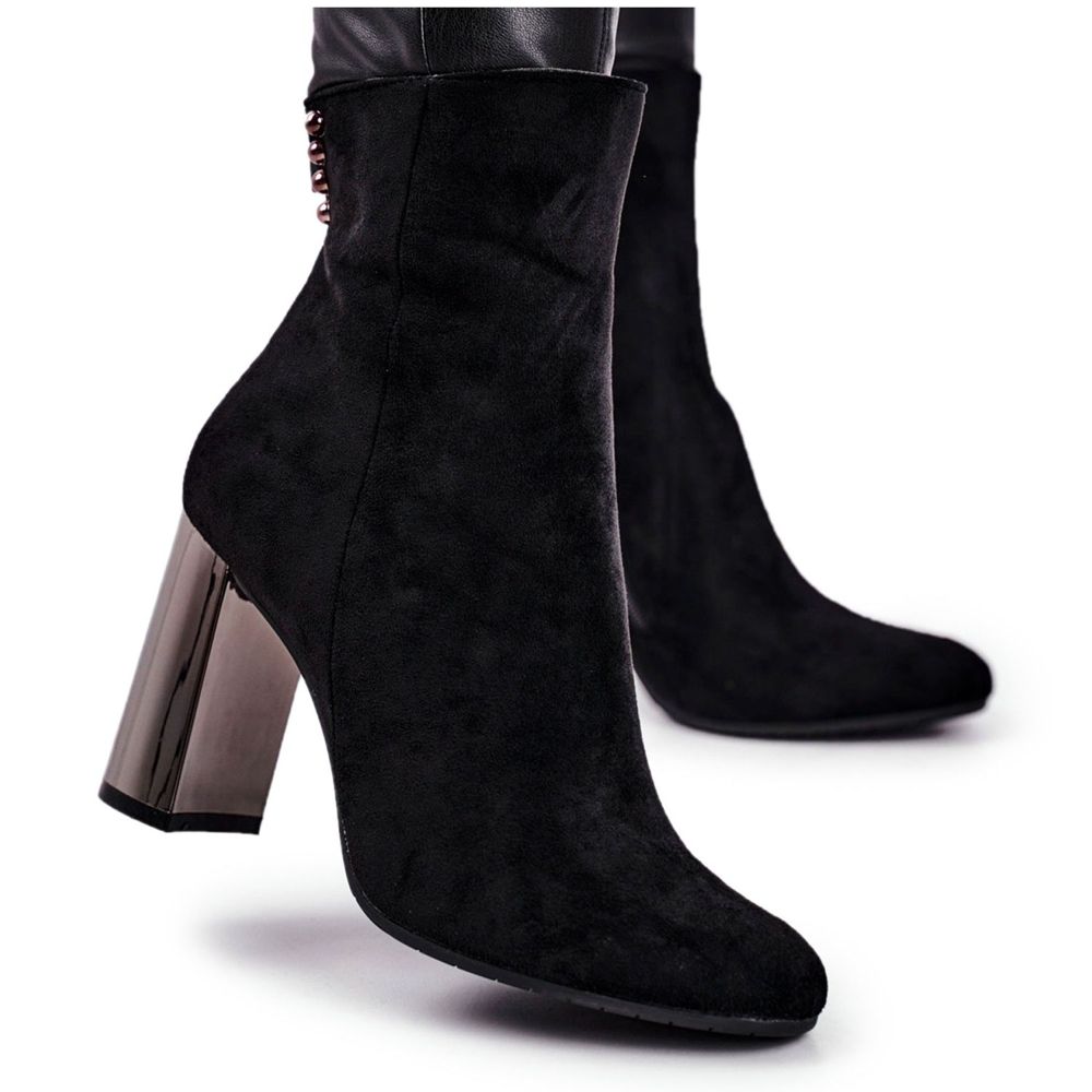 15,5 cm:n yläkorkeudellaan nämä saappaat korostavat jalkojasi täydellisesti, ja elegantin mustan värinsä ansiosta ne sopivat täydellisesti useisiin asuihin: farkuista ilmaviin mekkoihin. Kannattaa myös kiinnittää huomiota muodikkaisiin yksityiskohtiin strassien muodossa, mikä lisää niihin hieman luonnetta.