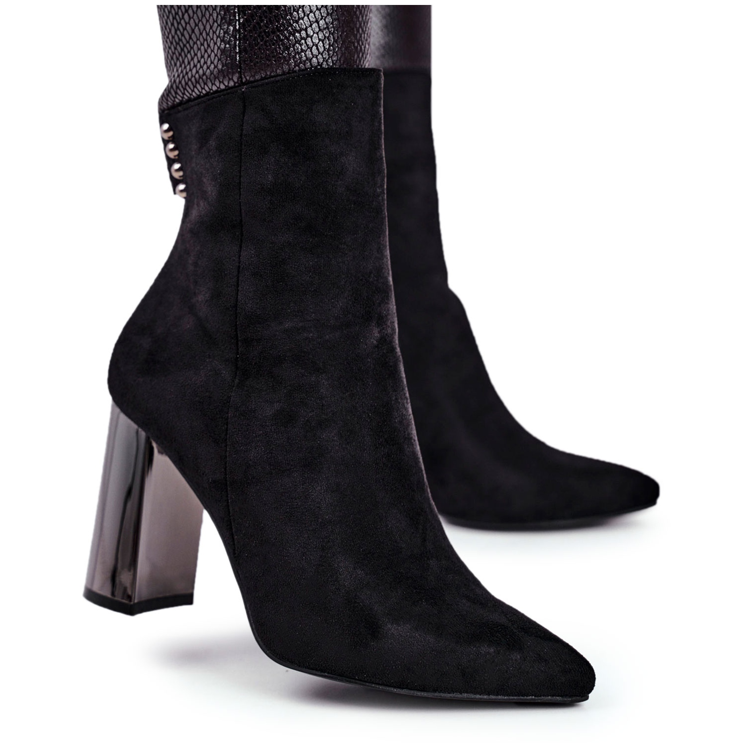 Löydä ainutlaatuiset naisten korkeakorkoiset nilkkurit tyylikkäässä mustassa värissä, jotka ovat uusia KeeShoes-kokoelmassa. Nämä korkealaatuisesta ekologisesta mokkanahasta valmistetut saappaat eivät vain näytä tyylikkäiltä, vaan myös takaavat käyttömukavuuden. 9,5 cm korkea peilikorko antaa niille modernia luonnetta ja vakaa tolppa takaa turvallisuuden kävellessä.