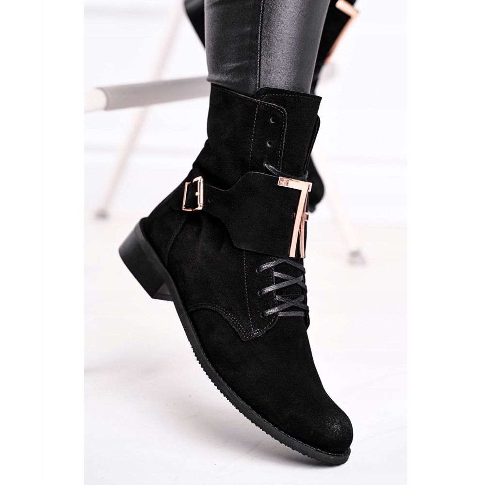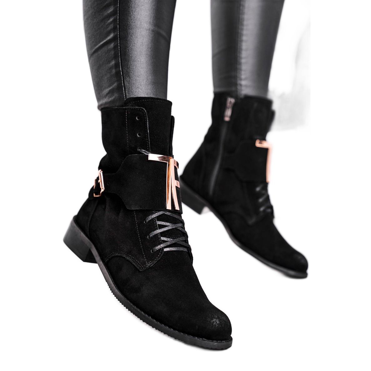Suuren soljen ja kultakirjaimien muodossa olevan koristeen ansiosta saappaat saavat ainutlaatuisen luonteen, joka sopii täydellisesti muotitrendeihin. Niiden käytännöllinen ompelu vetoketjun sivulla helpottaa pukemista, ja lisänauhat mahdollistavat täydellisen istuvuuden jalassa.