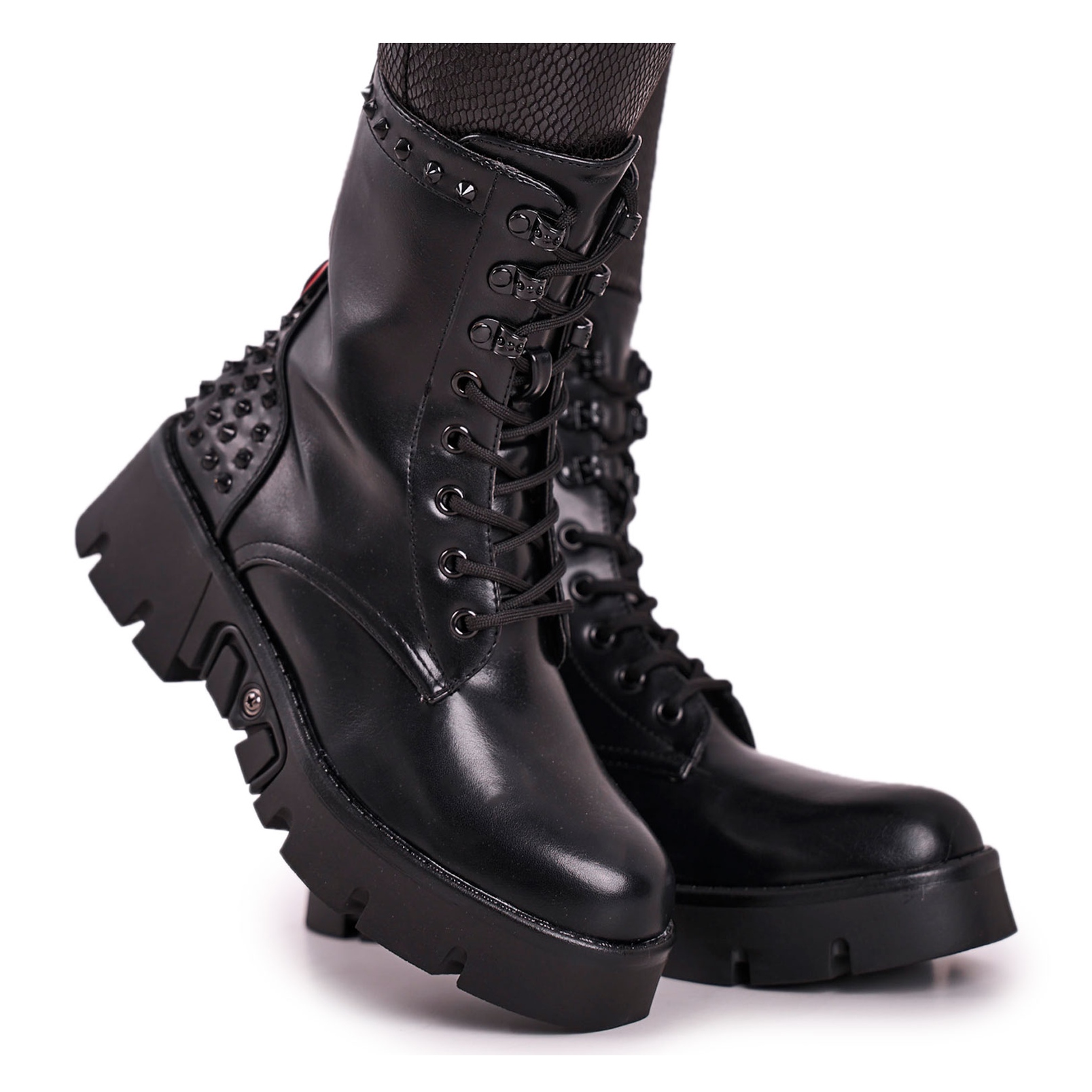 Naisten saappaat Platform FG2 Grunge-tyyliin ovat ihanteellinen tarjous naisille, jotka haluavat lisätä tyyliinsä luonteenomaisen, vahvemman aksentin. Nämä mustat saappaat erottuvat kiinteästä, korkeasta alustasta ja ainutlaatuisesta koristeesta mustien strassien muodossa. Klassinen nauhoitusleikkaus, jota täydentää käytännöllinen vetoketju sivulla, takaa muodikkaan ulkonäön, mutta myös mukavuuden ja helppouden pukemisen.