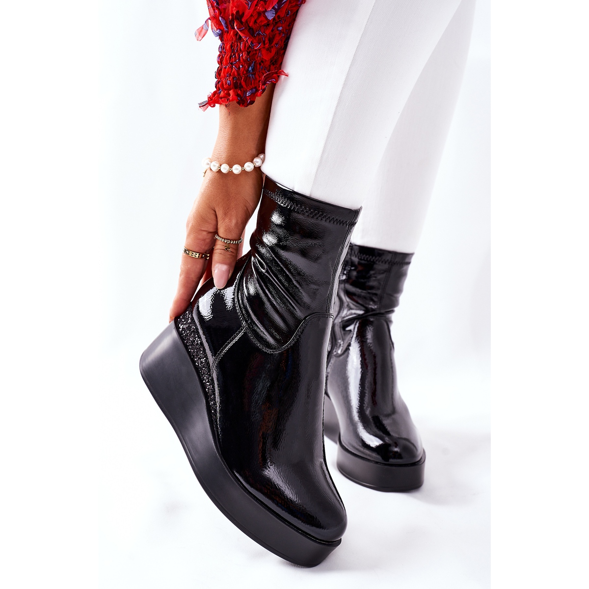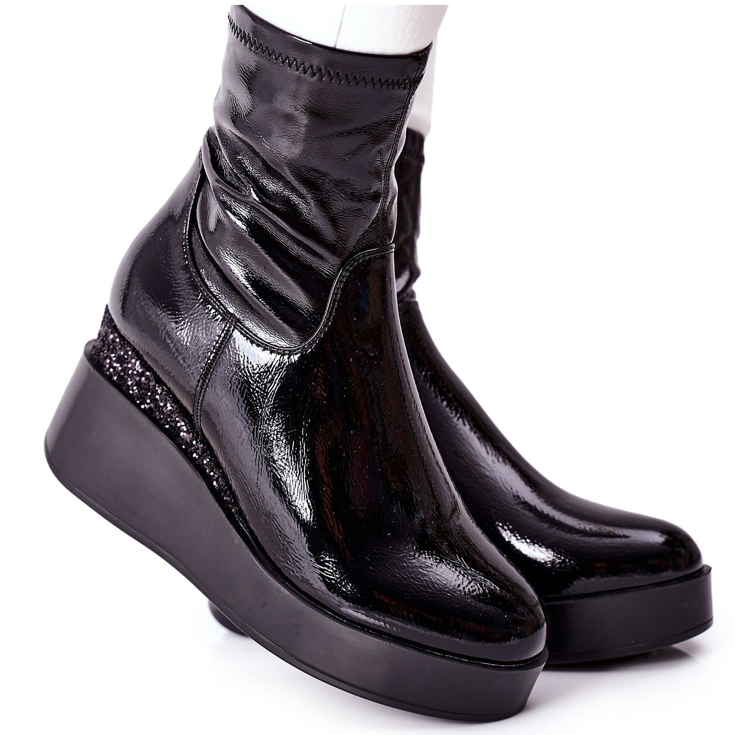 Yksityiskohdat: S.Barski Naisten saappaat Wedge -lakatulla mustalla terapialla