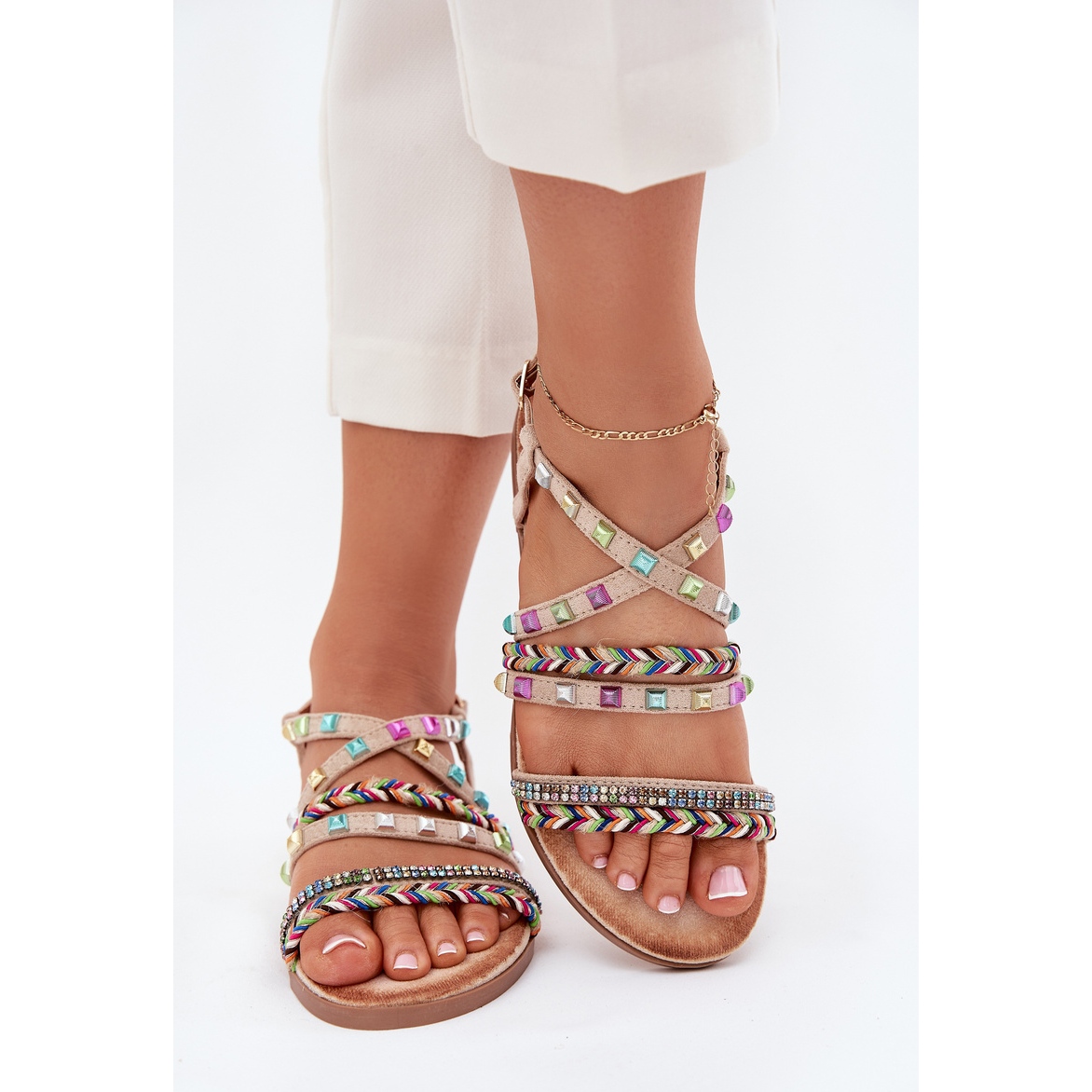 Koristeet ja punotut raidat erottavat tämän mallin antaen sille ainutlaatuisen hahmon, joka varmasti herättää huomion. Säädettävä hihna soljen kanssa antaa sinun sovittaa jalan täydellisesti, mikä lisää käytön mukavuutta - täydellinen pitkiä kesäpäiviä.