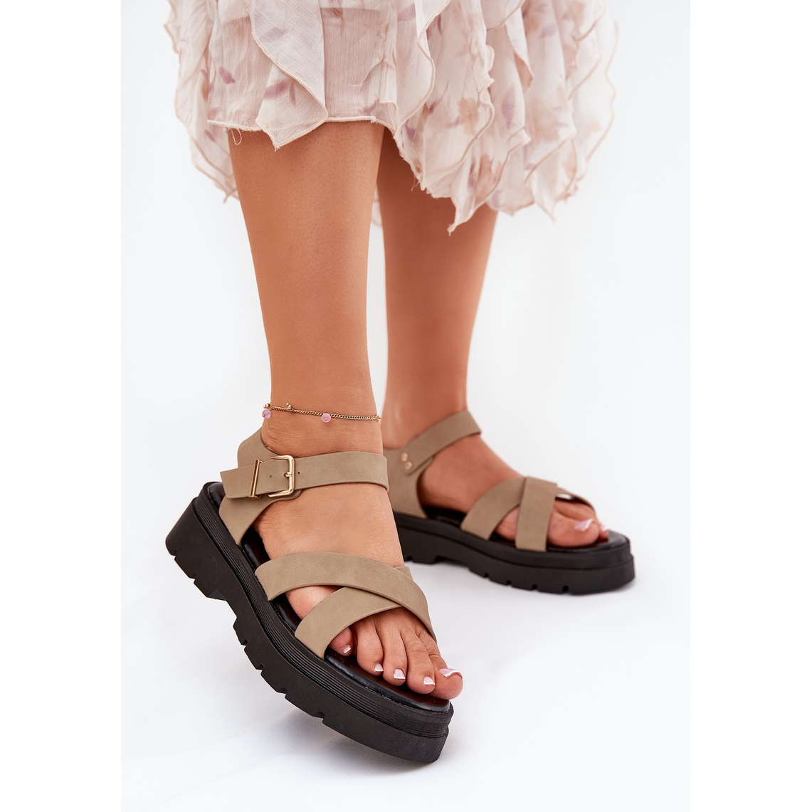 Esittelemme tyylikkäitä naisten sandaaleja alustalla, joissa yhdistyvät tyylikkyys ja mukavuus. Korkealaatuisesta ekologisesta nahasta valmistettu sandaalit beige -varjossa ovat erinomainen valinta lämpimiksi päiviin. Niiden ainutlaatuinen muotoilu, joka perustuu kahteen etuosaan kietoutuneeseen hihnaan, lisää merkkiä ja tekee jokaisesta tyylistämismaksusta omaperäisyyden.