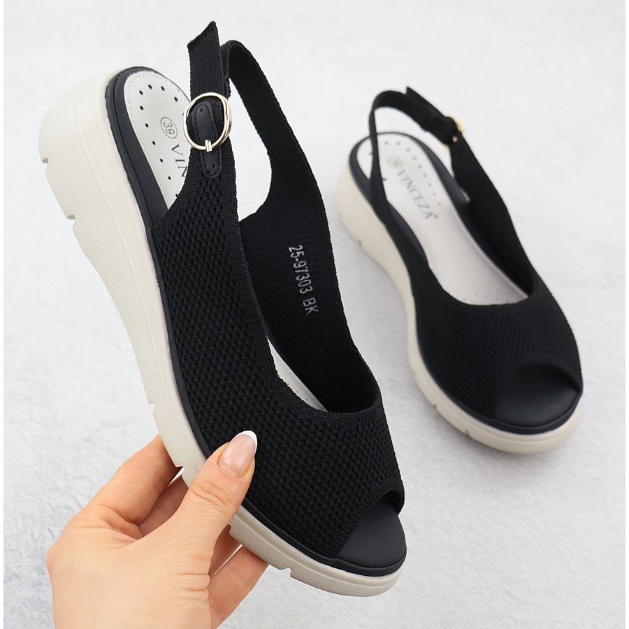 Esittelemme naisten sandaalit tekstiilikiilassa tyylikkäässä mustassa värissä tunnetulta Vinceza -tuotemerkiltä. Malli 97303 on täydellinen yhdistelmä tyyliä, mukavuutta ja muotia, mikä varmasti vetoaa jokaiseen moderniin naiseen.