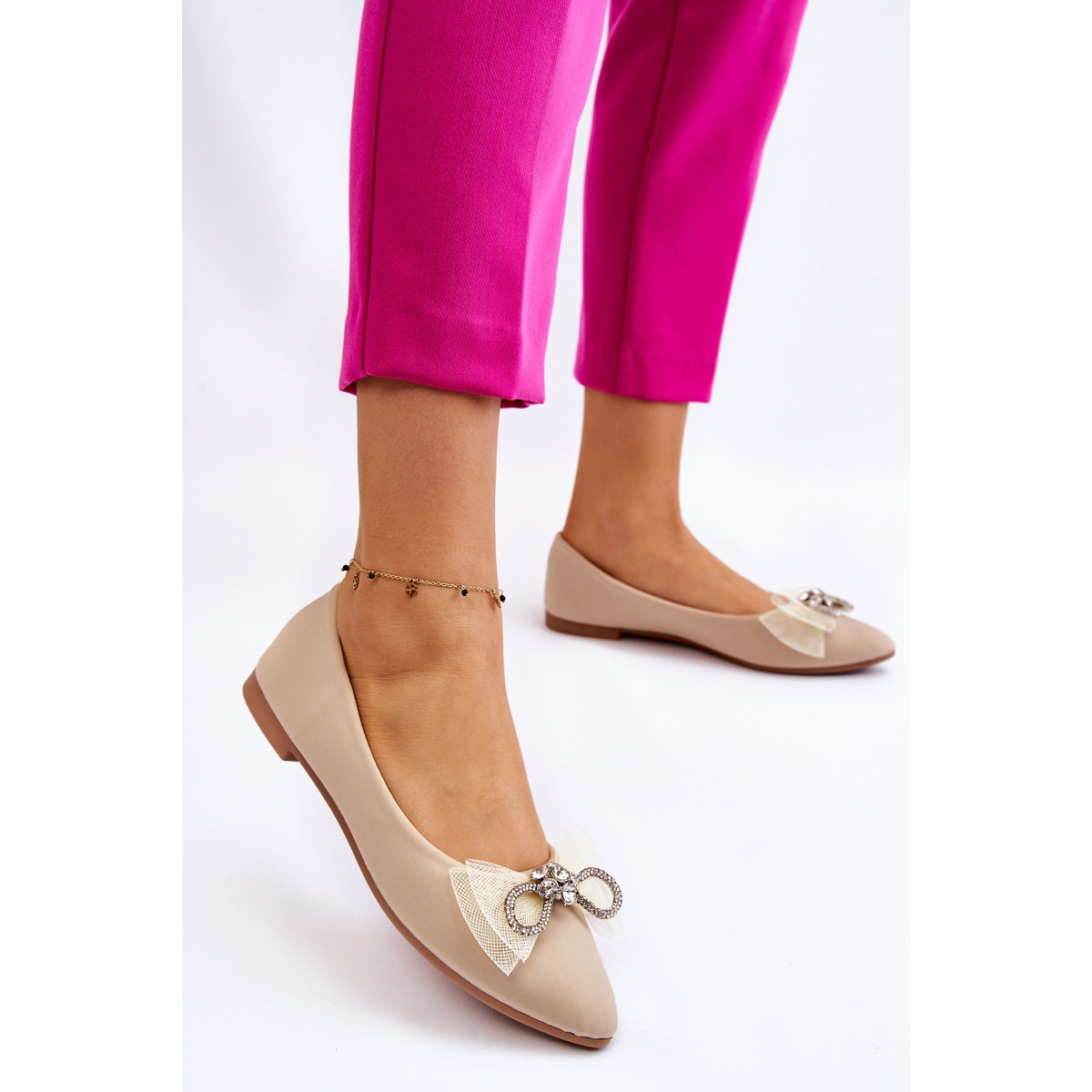 Yksityiskohdat: Naisten teräväkärkiset ballerinat, joissa koristeellinen rusetti beige valoisa