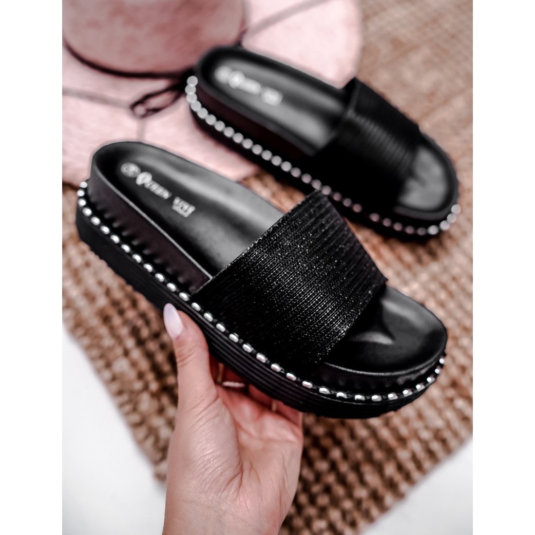Valmistaja: Toinen tuotemerkki. Tyyppi: liukastu; Väri: musta hopeaelementeillä; Lisää materiaali: kumi; Alustan korkeus: 5 cm.
