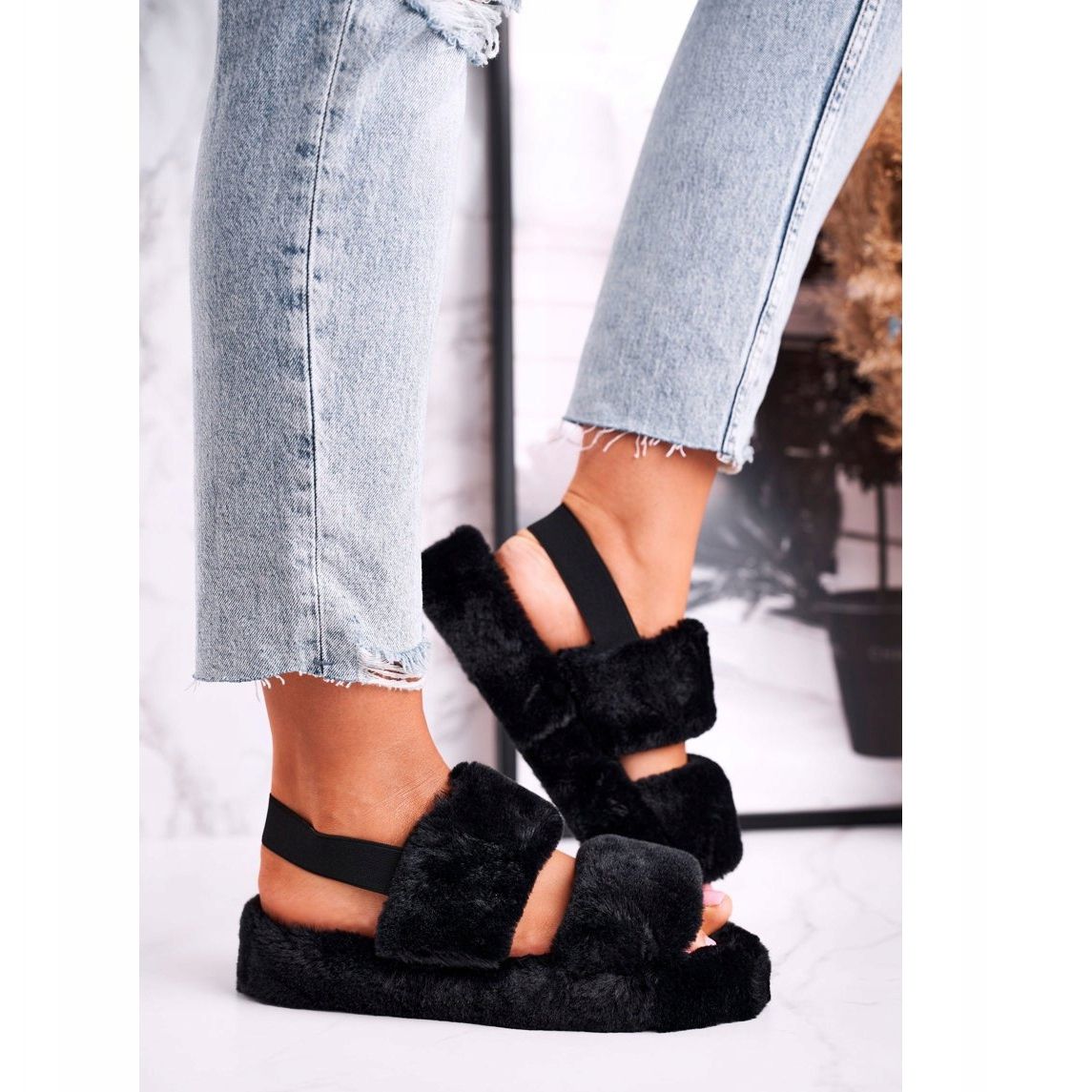 Yksityiskohdat: FJ1 Naisten tossut alustalla Fur Black Cotton Candy musta