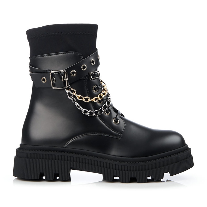 Esittelemme ainutlaatuiset naisten jalkineet Shelovetin ketjuilla, jotka ilahduttavat jokaista muodikkaiden ja mukavien kenkien ystävää. Nämä laadukkaasta ekologisesta nahasta ja tekstiilimateriaalista valmistetut mustat nilkkurit yhdistävät eleganssia ja rock-tyyliä ja sopivat täydellisesti rennon arkiseen ilmeeseen.