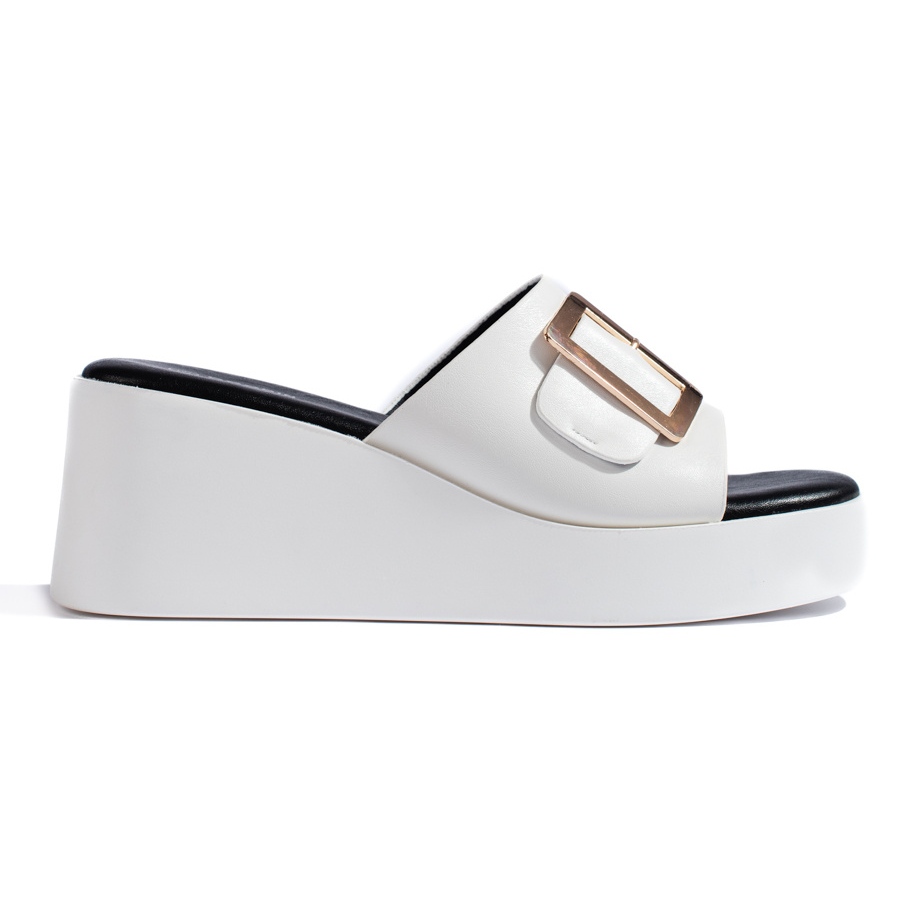 Hienovaraisilla kullanvärisillä aksenteilla koristellut valkoiset kiilamuulit sopivat täydellisesti moniin tyyleihin arkiasuista tyylikkäämpiin seteihin. Ekologisesta nahasta valmistettu pohjallinen takaa riittävän ilmanvaihdon ja mukavuuden jaloille koko päivän.