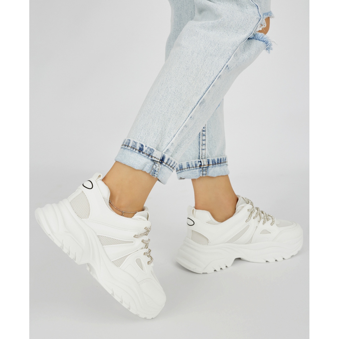 Etsitkö kenkiä, jotka vastaavat sekä urheilua että rento tyyliä? Nämä valkoiset lenkkarit täyttävät varmasti odotuksesi! 5 cm: n korkean alustan ansiosta voit nauttia lisäsuhteesta ja luottamuksesta. Kiinnitys nauhojen muodossa mahdollistaa jalan helpon istuvuuden, ja niiden valkoinen väri tekee niistä täydellisen täydennyksen jokaiselle vaatekaapille.