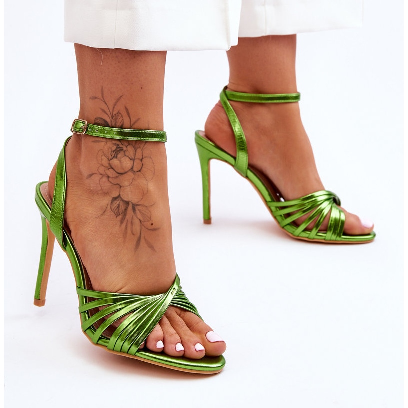Tyylikkät sandaalit tapissa muodikkaassa, vihreässä värissä - täydellinen iltamatkoihin, juhliin ja kesäjuhliin. Valmistettu ekologisesta nahasta, hengittävällä, avoimella varpalla ja koristeellisilla, sidotut hihnat edessä. Sandaalit kiinnitetään nilkan ympärille säädettävälle solkille, upotettuna ohuelle korkokentälle, jonka korkeus on 10,5 cm. Klassinen leikkaus modernissa versiossa - tyylikäs ja naisellinen.