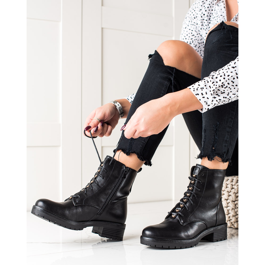 Saappaissa on 4 cm:n tasainen kantapää ja 2 cm:n alusta, mikä ei vain lisää askeleen keveyttä, vaan myös pidentää jalkoja. Valmistettu korkealaatuisesta keinonahasta, ne näyttävät erittäin tyylikkäiltä ja moderneilta. Pehmeä tekstiilivuori lisää mukavuutta, ja vetoketju ja nauhat helpottavat pukemista ja säätämistä jalkaan.