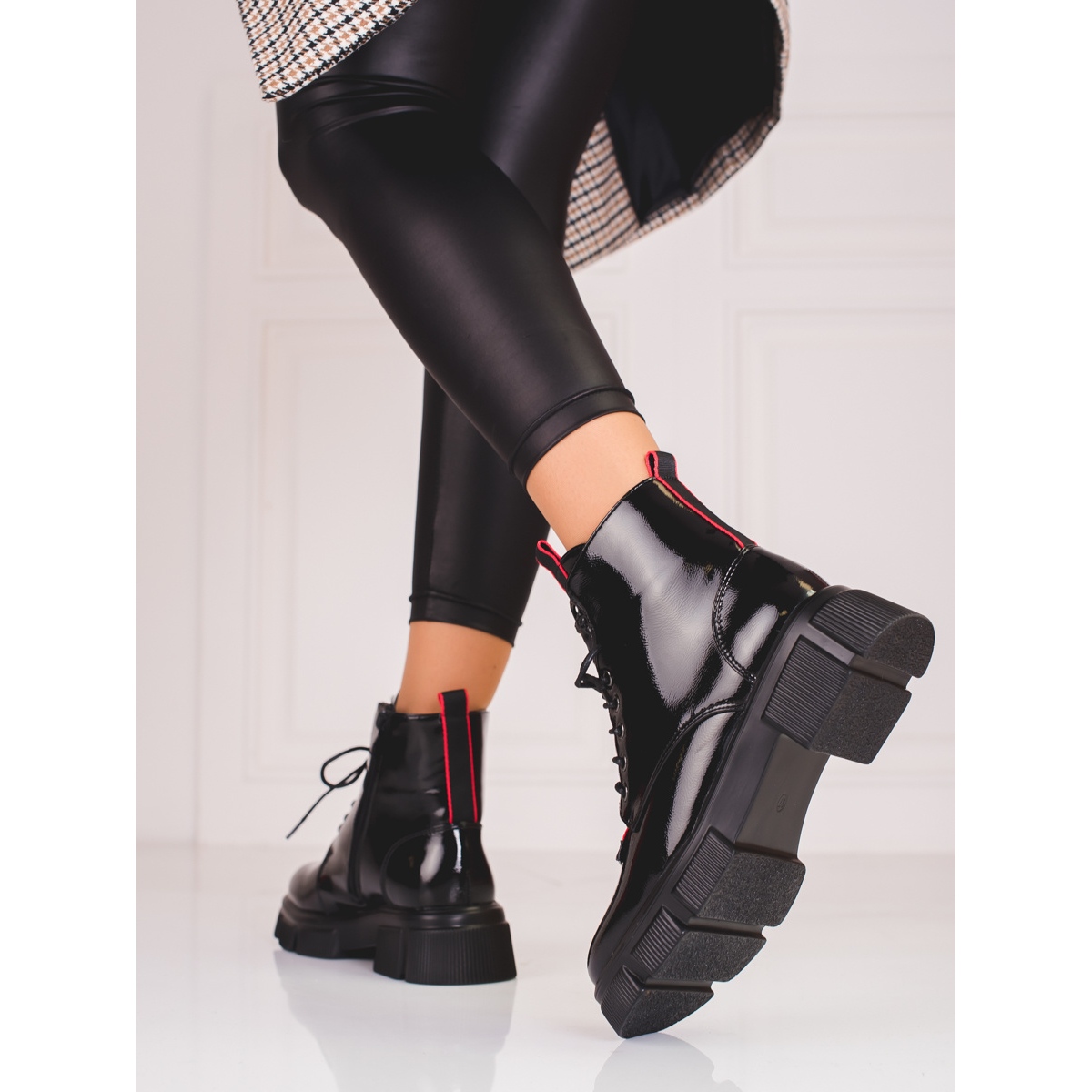Yksityiskohdat: Nauhatut naisten Shelovet vaaleat lakatut saappaat musta