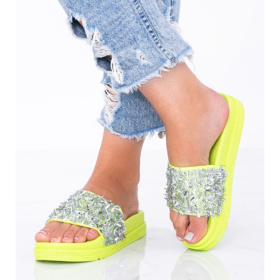 Vihreät neonvarvastossut strassit Love Bling ovat täydellinen valinta tyyliä ja kiiltoa rakastaville naisille. Tämä malli erottuu siitä, että sen päällinen on koristeltu hopeisilla zirkoneilla, jotka kimaltelevat kauniisti auringonsäteissä ja lisäävät taikuutta jokaiseen askeleeseen. Varvastossut sopivat täydellisesti ranta- ja kesäkävelyihin tarjoten mukavuutta ja muodikkaan ilmeen.