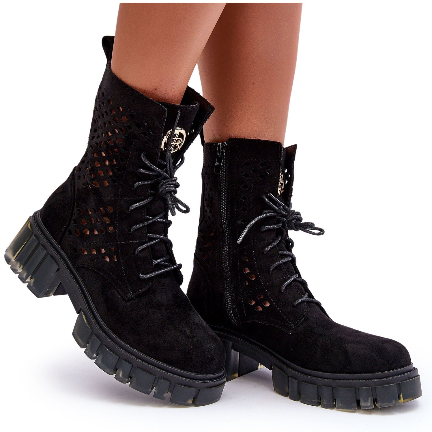 Tyylikäs ja samalla RAW-muodossa avoimissa työläisten saappaissa mustassa ekologisessa osassa on ihanteellinen ehdotus naisille, jotka arvostavat muoti ja mukavuutta. Yläosa koristeltu herkällä avoimella kuviolla, kiinnitetty käytännöllisellä lukolla ja myös nauhoitettu parempaan istuvuuteen. Kielen jäykistetty kantapää ja koristelu korostavat kengän luonnetta ja massiivinen posti 5,5 cm korkea 3 cm: n alustalla varmistavat stabiilisuuden ja eristyksen kylmästä maasta.