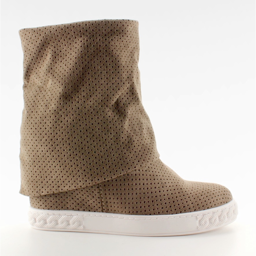Tyylikkäät naisten nilkkurit, joissa on piilokiila, joissa yhdistyvät keveys ja eleganssi. Valmistettu ekologisesta mokkanahasta harjatussa muodossa, pehmeä, rullattu päällinen. Piilotettu 8 cm kantapää muotoilee täydellisesti figuuria säilyttäen samalla käyttömukavuuden.