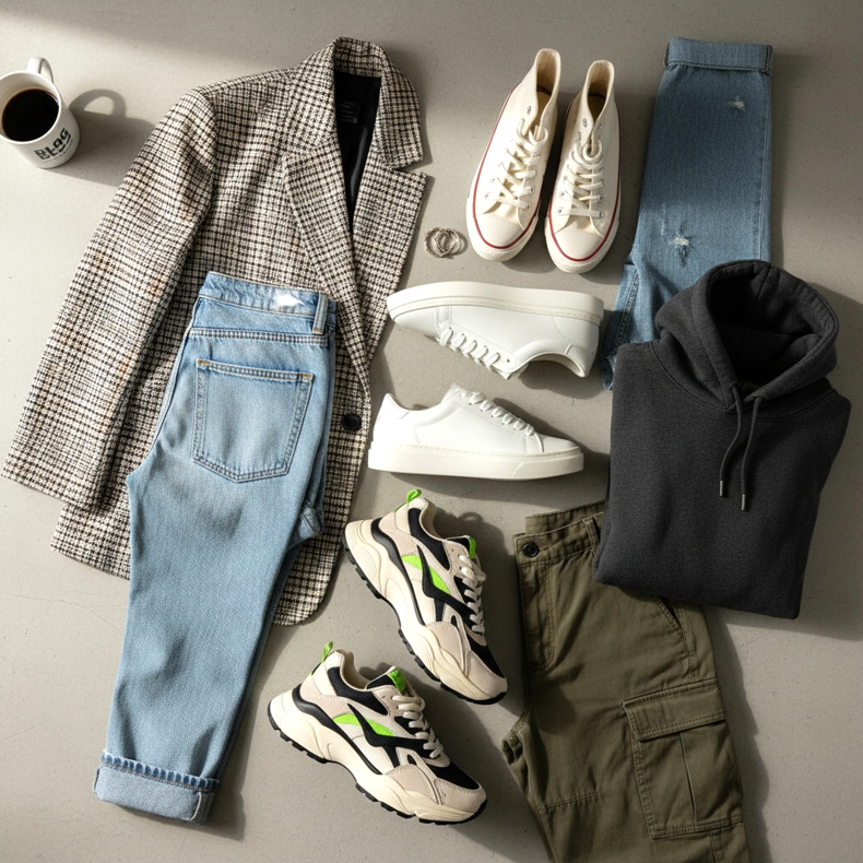 Miksi? Löysät vaatteet lisäävät volyymia – jos et tasapainota niitä oikeilla kengillä, vaikutus voi olla ylivoimainen, ei huoleton. Asianmukaiset jalkineet luovat viitepisteen koko vartalolle - ne määrittelevät mittasuhteet ja antavat tyyliin luonnetta. Kengät ratkaisevat, näyttääkö ylimitoitettu ulkonäkösi lehden kannelta vai pyjamalta ulkoiluun.