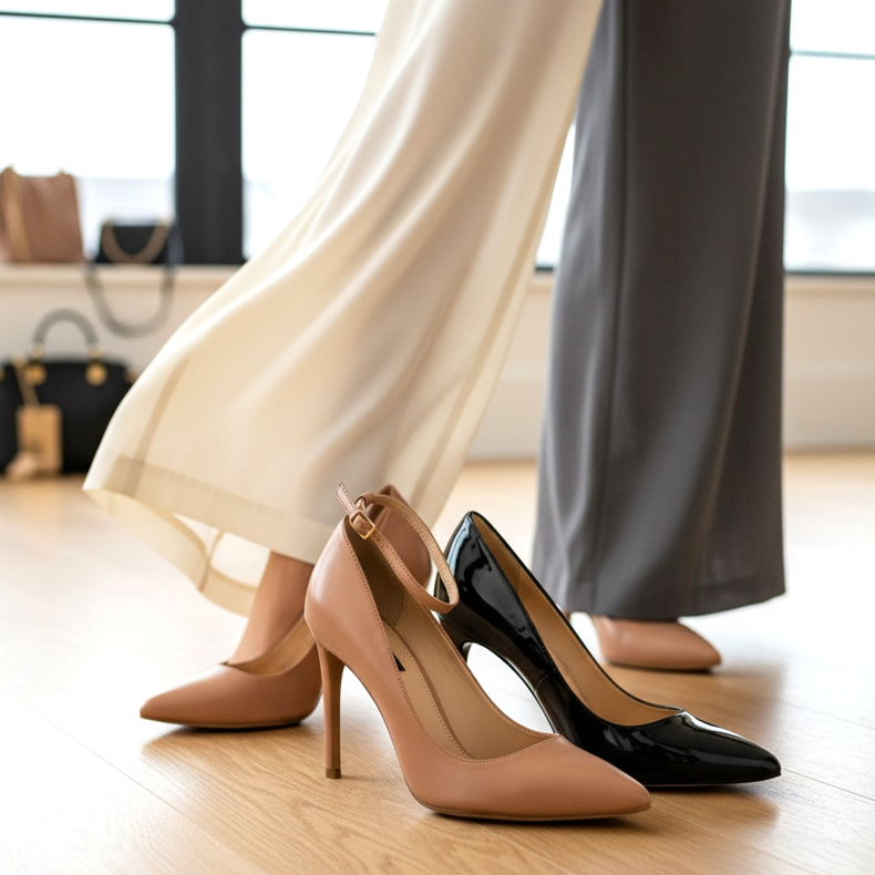 Klassisin ja turvallisin yhdistelmä on leveät housut, joissa on keskikorkoiset tai korkokengät. Kantapää pidentää jalkoja ja nostaa figuuria, mikä tasapainottaa täydellisesti leveiden jalkojen volyymia. Teräväkärkiset pumput toimivat parhaiten - ne kapenevat optisesti ja lisäävät eleganssia.