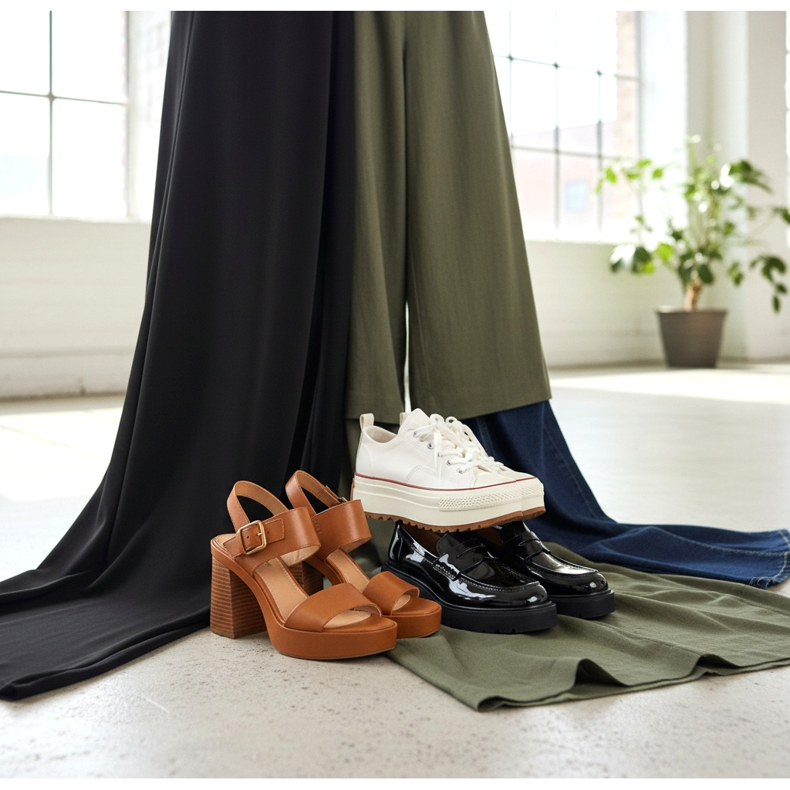 Platform-loaferit ovat hitti smart casualissa – korkeavyötäröiset palazzo-loaferit, joissa on suora yläosa, luovat vaivatonta tyylikkyyttä, jotka sopivat täydellisesti toimistoon, lounaalle tai tapaamiseen ystävien kanssa. Platform lenkkarit puolestaan antavat leveille housuille rennon katuluonteen.