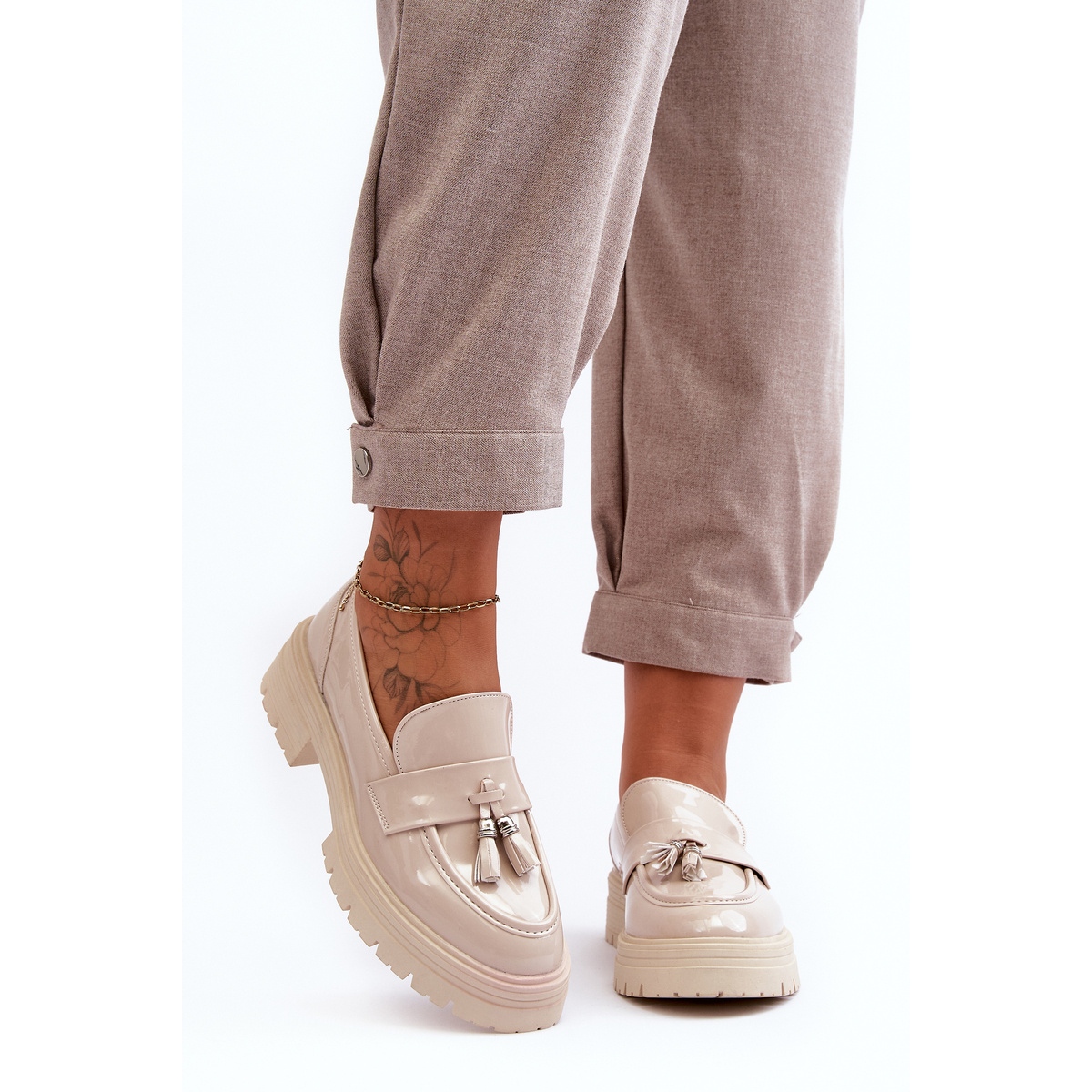 Yksityiskohdat: Patenttiloafer-kengät hapsuilla, vaalea beige Velenase