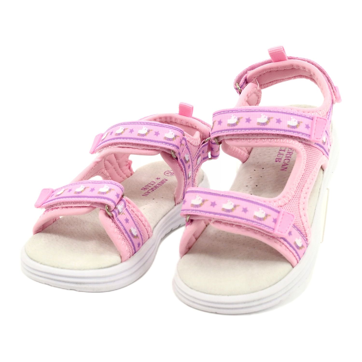Pink Sandaalit American Club RL39 - viehättävät ja mukavat jalkineet pienelle elegantkalle. Hienovarainen yhdistelmä vaaleanpunaisia ja violetteja ja koristeellisia elementtejä, joissa on yksisarvinen aiheen raidoilla, tekee jokaisesta lähtöstä ainutlaatuisen. Se on täydellinen valinta tytölle, joka haluaa esitellä itsensä muodikkaana.