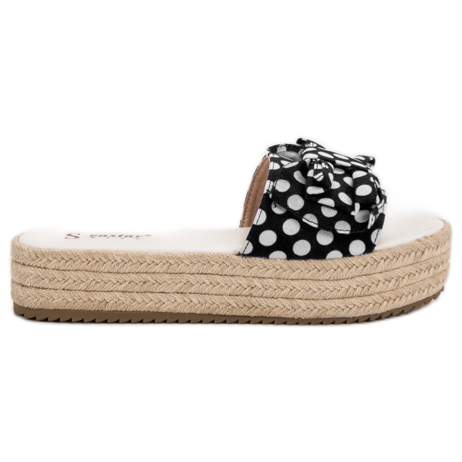 Seastar Black Dot Flip-Flops on erittäin tyylikäs valinta kevät/kesäkauteen! Näissä hurmaavissa varvastossoissa on leveä olkahihna, jossa on muodikas pistekuvio, joka tukee jalkaa tehokkaasti. Suuri rusetti antaa niille tyttömäisen viehätyksen, joten ne sopivat täydellisesti jokaiselle naiselle, joka haluaa näyttää ilmiömäiseltä jokapäiväisessä tyylissä.