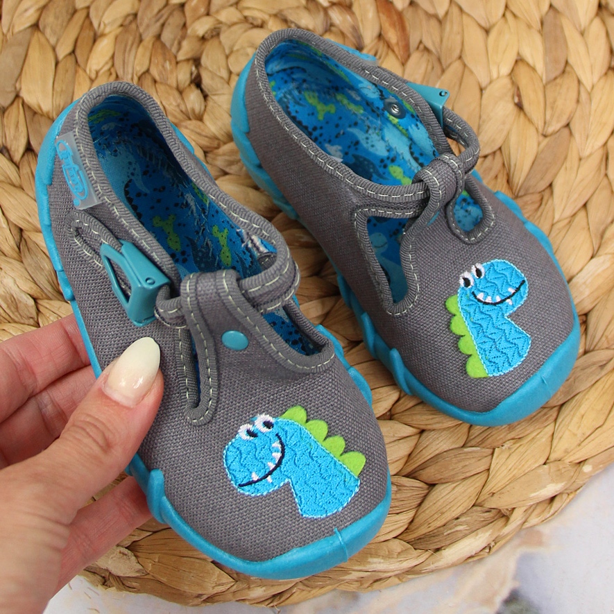 Käytännölliset ja mukavat tossut befado -pojalle, joka on luotu päiväkotille ja kotiin. Harmaa tekstiilimateriaali, jossa on koristeellinen dinosaurusmotiivi, tekee kengistä universaalin ja houkuttelevan lapsille. Kevyt, joustava pohja, jonka paksuus on 1 cm, varmistaa vakauden päivittäisillä peleillä sisäpeleissä.