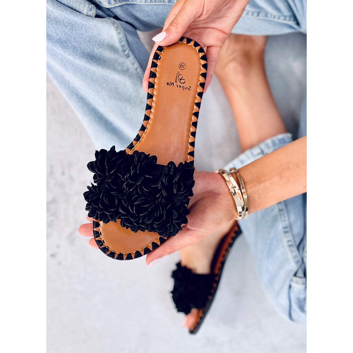 Valmistettu ekologisesta mokkanahasta, se takaa paitsi käyttöilon, myös tietoisuuden ympäristöystävällisen tuotteen valinnasta. Mustat varvastossut on koristeltu hienovaraisilla, kukkaistutuksilla, jotka herättävät huomiota ja lisäävät keveyttä mihin tahansa tyyliin. Tämän ansiosta ne voivat olla loistava aksentti arjen asuihin, niin arkisiin kuin hieman tyylikkäisiinkin kesämekoihin.
