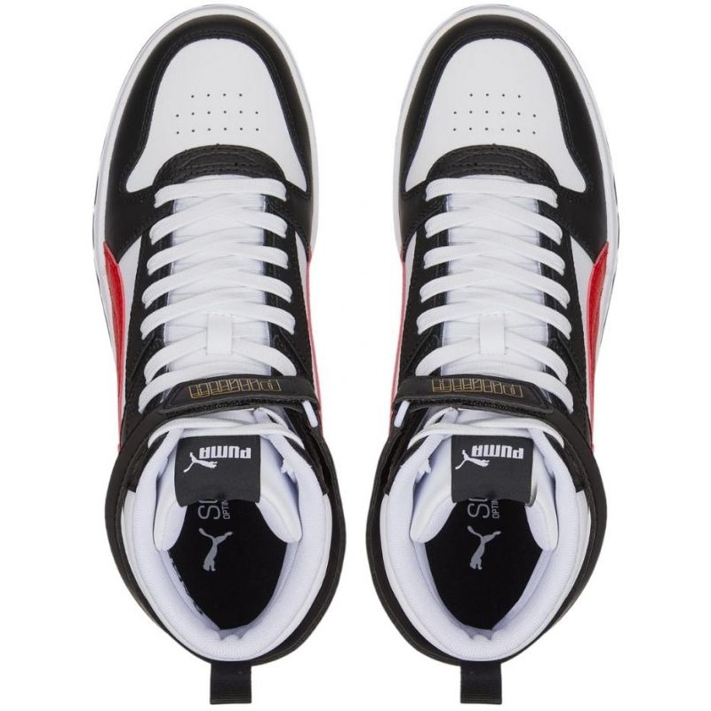 Puma RBD -peli on korkeat lenkkarit, joissa yhdistyvät klassinen, nahkainen yläosa moderneilla mukavuusratkaisuilla. Hallitsevan valkoisen malli, jolla on musta ja punainen aksentti, toimii päivittäisenä elämäntavan kenkänä - kaupunkien tyylit ja rentoasut siirtymäkauden ajan.