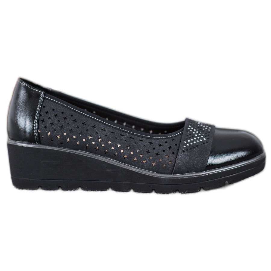 Cubic-zirkonialla varustetut Comer-pumput ovat täydellinen valinta naisille, jotka haluavat yhdistää eleganssin ja mukavuuden. Nämä korkealaatuisista materiaaleista valmistetut mustat kengät vaikuttavat ainutlaatuisella muotoilullaan ja tarkalla viimeistelyllään. Pyöreä nenä ja sisäänrakennettu pehmeä kantapää takaavat käyttömukavuuden, ja pieni 4,5 senttimetrin kiila tekee pumpuista vakaat ja täydelliset eri tilanteisiin.