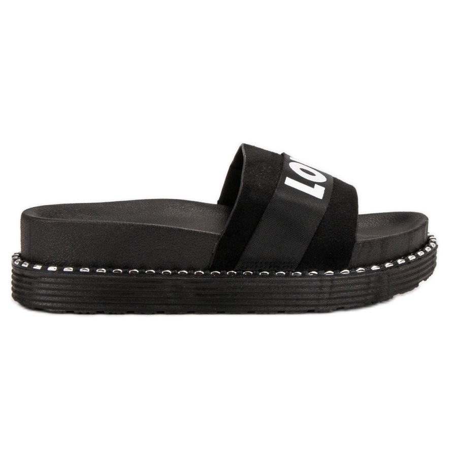 Queen Vivi naisten varvastossut Suede Love -varvastossut mustat ovat tämän vuoden todellinen hitti. Ne on valmistettu korkealaatuisesta mokkanahasta, ja niille on ominaista tyylikäs "LOVE"-kirjoitus, jonka ansiosta ne sopivat täydellisesti viimeisimpiin ympärillämme oleviin muotitrendeihin.