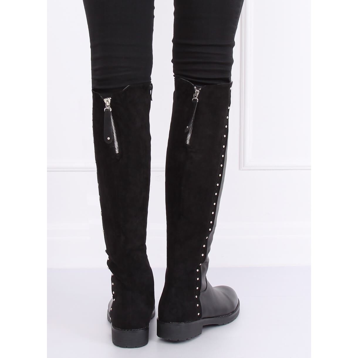 Klassisen mustan värinsä ansiosta ne sopivat täydellisesti eri tyyleihin - arkisesta tyylikkäämpään. Polviin asti ulottuva korkea päällinen, joka on koristeltu katseenvangitsijanastoilla ja strassilla, antaa kengille selkeän luonteen ja erottuu joukosta.