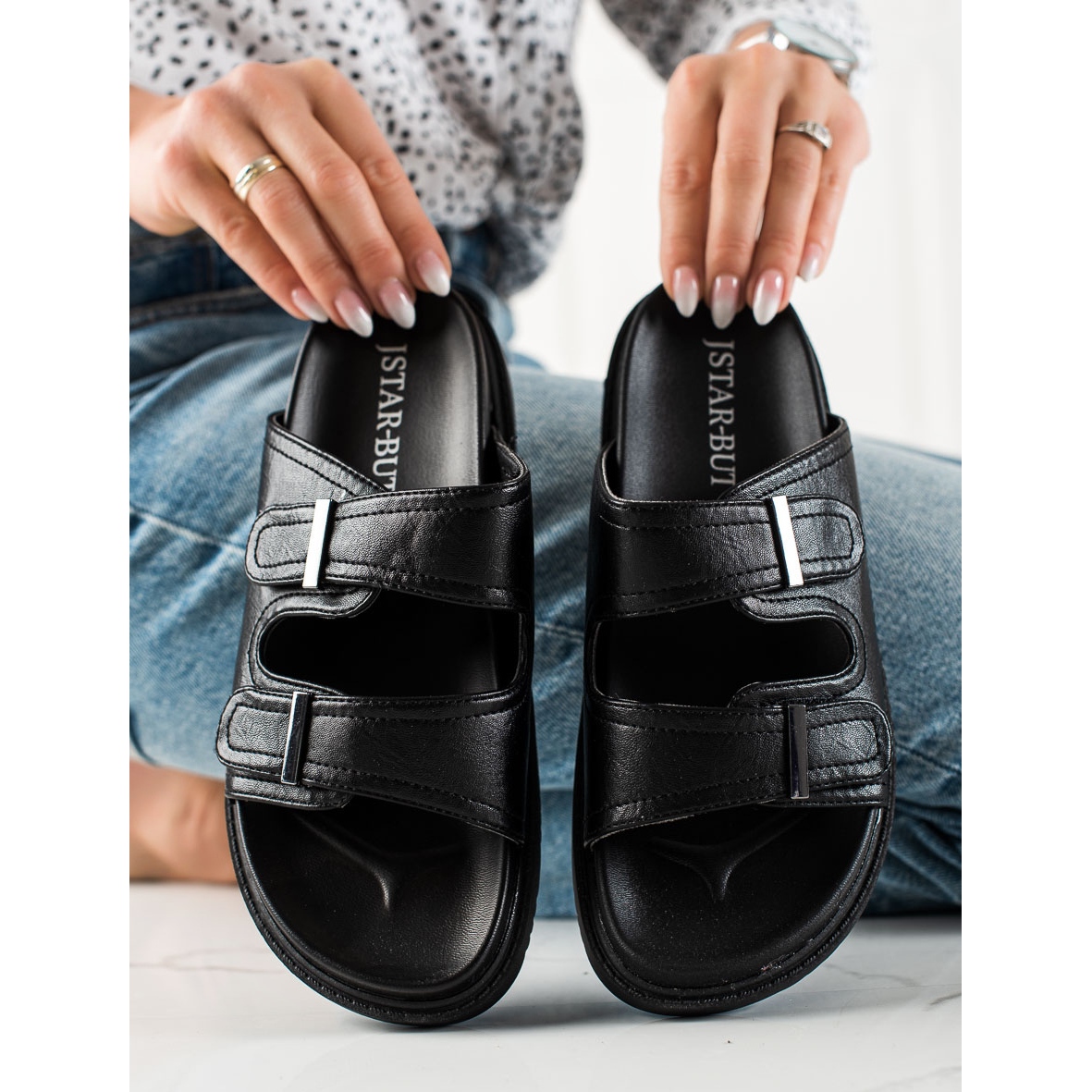 Löydä mukavuuden ja tyylin uusi ulottuvuus J. Starin tarranauhaläppäillä! Nämä klassisen mustan väriset rennot varvastossut ovat täydellinen valinta lämpimiin kevät- ja kesäpäiviin. Valmistettu korkealaatuisesta ekologisesta nahasta, ne eivät vain näytä hyvältä, vaan myös huolehtivat ympäristöstä.
