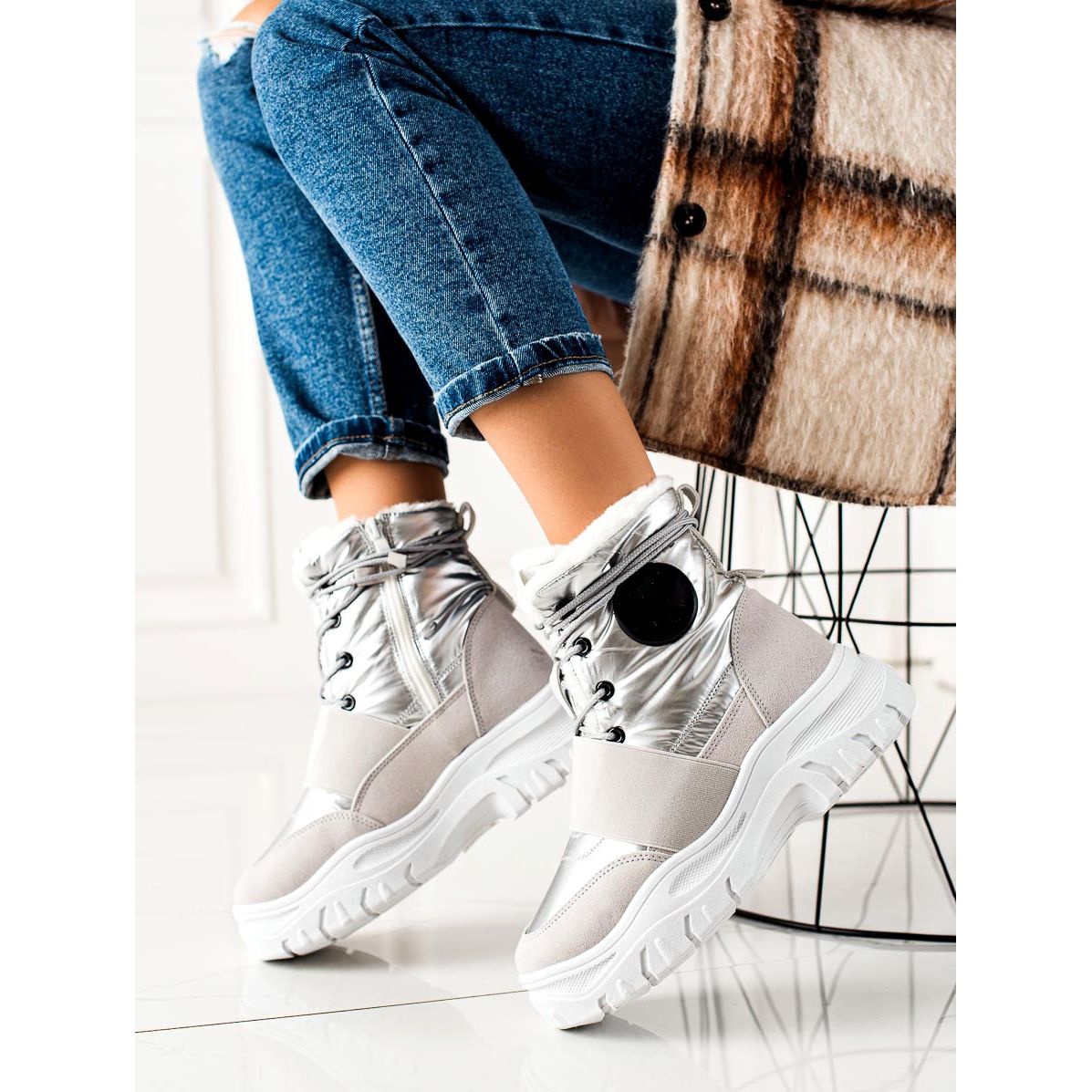 Löydä ainutlaatuinen mukavuus ja muodikas ulkoasu TRENDI Casual Snow Boots -saappaat hopean ja harmaan sävyissä. Nämä tyylikkäät kengät ovat täydellinen valinta syys/talvikaudelle, ja ne tarjoavat lämpöä ja mukavuutta kylminä päivinä. Eristyksen ja sisäänrakennetun pehmeän kantapään ansiosta jalkasi tuntevat olonsa mukavaksi sääolosuhteista riippumatta.