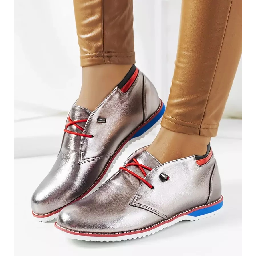Reyes hopeiset naisten kengät ovat täydellinen valinta naisille, jotka haluavat lisätä kiiltoa kevääseen tyyliinsä. Nämä tyylikkäät kengät on valmistettu korkealaatuisesta ekologisesta nahasta, ja ne erottuvat silmiinpistävällä metallivärillä. Punaiset ja siniset aksentit erottuvat hienovaraisesti hallitsevan hopean kanssa antaen jalkineille omaperäisyyttä ja ilmaisua.
