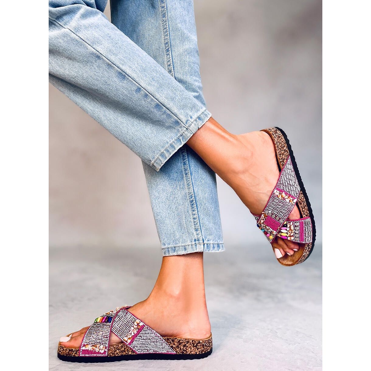 Löydä ainutlaatuiset naisten tossut helmillä Rezai-korkista fuksian sävyssä! Näissä tyylikkäissä varvastossoissa yhdistyvät muoti ja mukavuus, ja ne ilahduttavat värikkäillä helmillä ja kiiltävillä zirkoneilla, jotka antavat niille etnisen luonteen. Nämä varvastossut sopivat täydellisesti kesäpäiviin, ja ne sopivat täydellisesti mihin tahansa rentoon tyyliin luoden yhtenäisen ja lomailoksen.