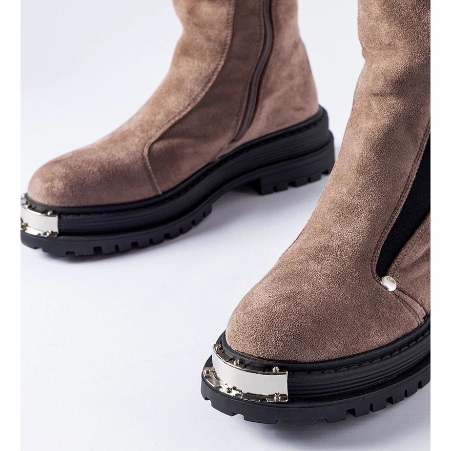 Lyhyet, eristetyt naisten saappaat muodikkaassa traupe -sävyssä (ruskea) yhdistävät mukavuuden hienovaraiseen eleganssiin. Valmistettu ekologisesta nahasta mokkanahkalla, lämmin pohjallinen ja käytännöllinen sivulukko - täydellinen viileämpiin päiviin syksyllä -talvikauden aikana.