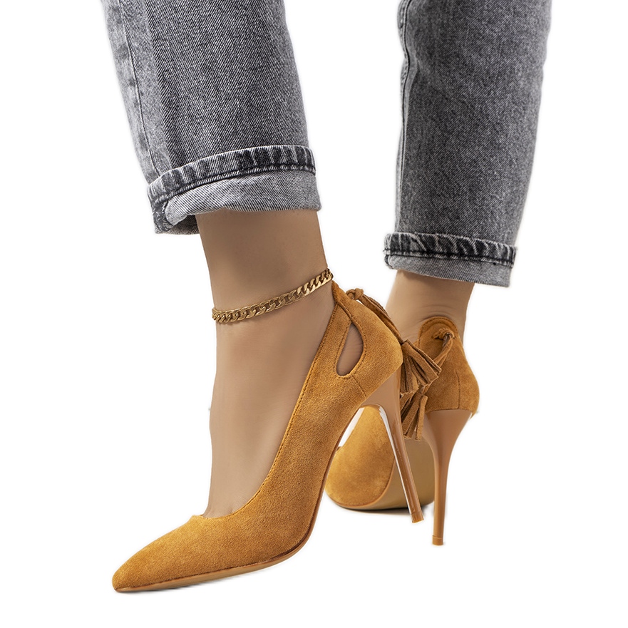 Brown Anthe -korkokengät koristeellisilla leikkauksilla ovat tyylikkäitä ja tyylikkäitä pumppuja, jotka sopivat täydellisesti kaikkiin juhliin. Klassinen korkokenkä ja terävä kärki korostaa tehokkaasti jalkoja tehden niistä ohuempia. Nämä korkealaatuisesta mokkanahkasta valmistetut kengät vaikuttavat paitsi muotoilullaan, myös käyttömukavuudellaan pehmeän pohjallisen ansiosta.