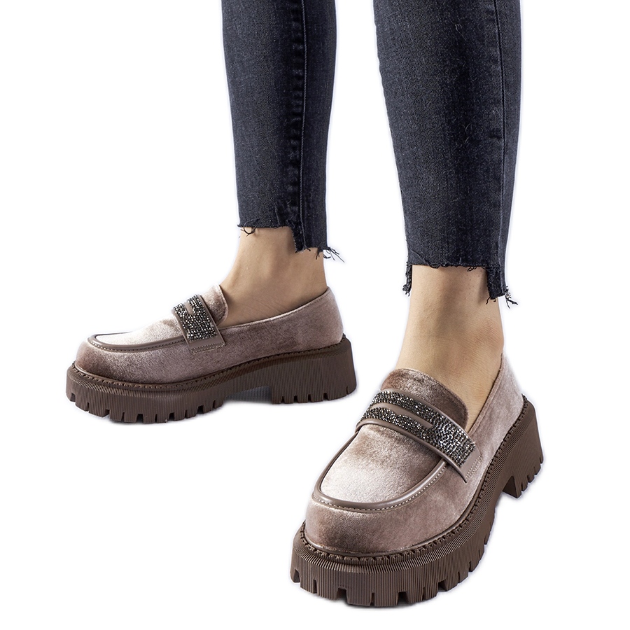 Yksityiskohdat: Ruskeat loaferit, koristeltu Longuelon strassit beige