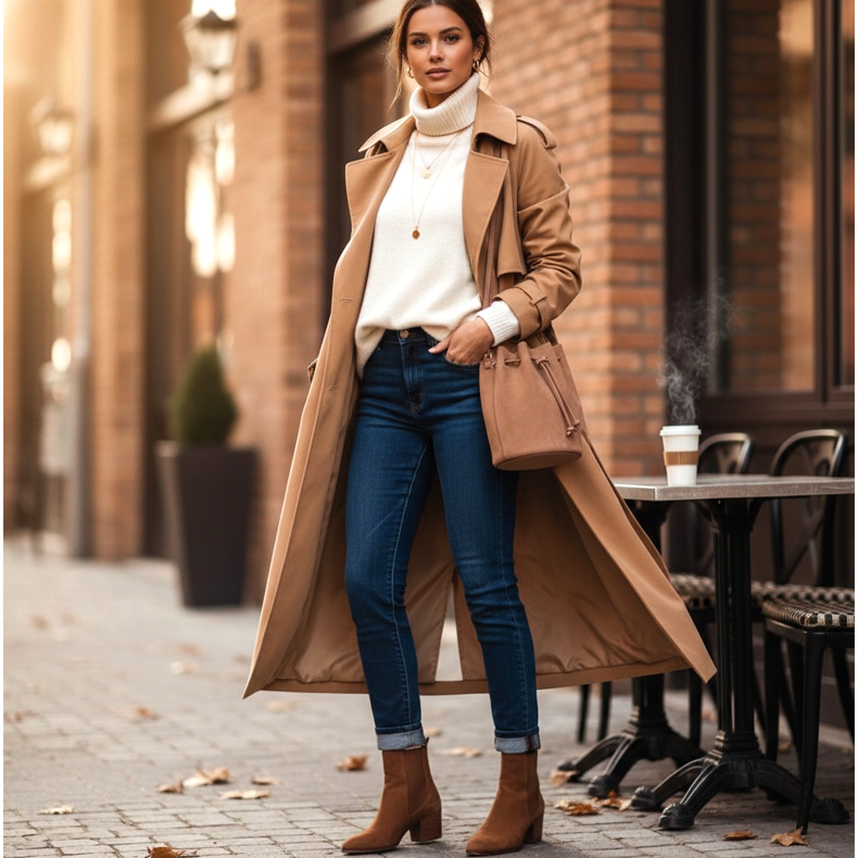 Tämä asu täydentyy pitkällä kamelinvärisellä trenssitakilla, nude mokkanahkaisella ämpärilaukulla ja huomaamattomilla kultakoruilla. Se on look, jota voit käyttää sekä aamukahvillesi että rennon liiketapaamiseen toimistossa. Se on mukava, tyylikäs ja aina ajan tasalla.