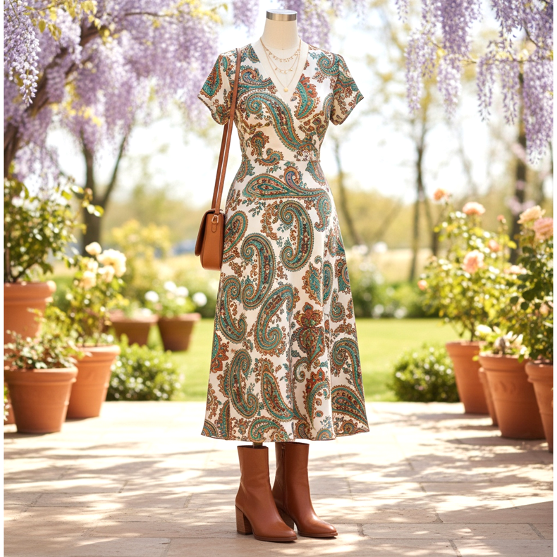 Viskoosista tai silkistä valmistettu paisley- tai kukkakuvioinen midimekko yhdistettynä ruskeisiin korkeakorkoisiin nilkkureihin on täydellinen look kevään häihin tai rakkaansa syntymäpäivään. Lisää ruskeanruskea nahkainen olkalaukku ja herkkä kaulakoru - efekti on valmis.