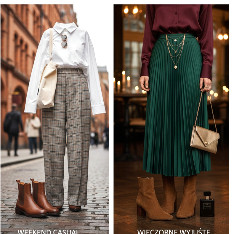 Rento viikonloppu: Leveät, ruudulliset housut (ns. ruudullinen housut) yhdistettynä valkoiseen T-paitaan tai yksinkertaiseen oxford-paitaan ja ruskeisiin Chelsea-saappaat - tämä on Lontoon muodikkaista kaduista inspiroitunut look, joka sopii yhtä hyvin viikonloppuostoksille kuin kahvilaan ystävien kanssa. Pitkä nahkalaukku tai kangaskassi ovat täydellinen lisävaruste.