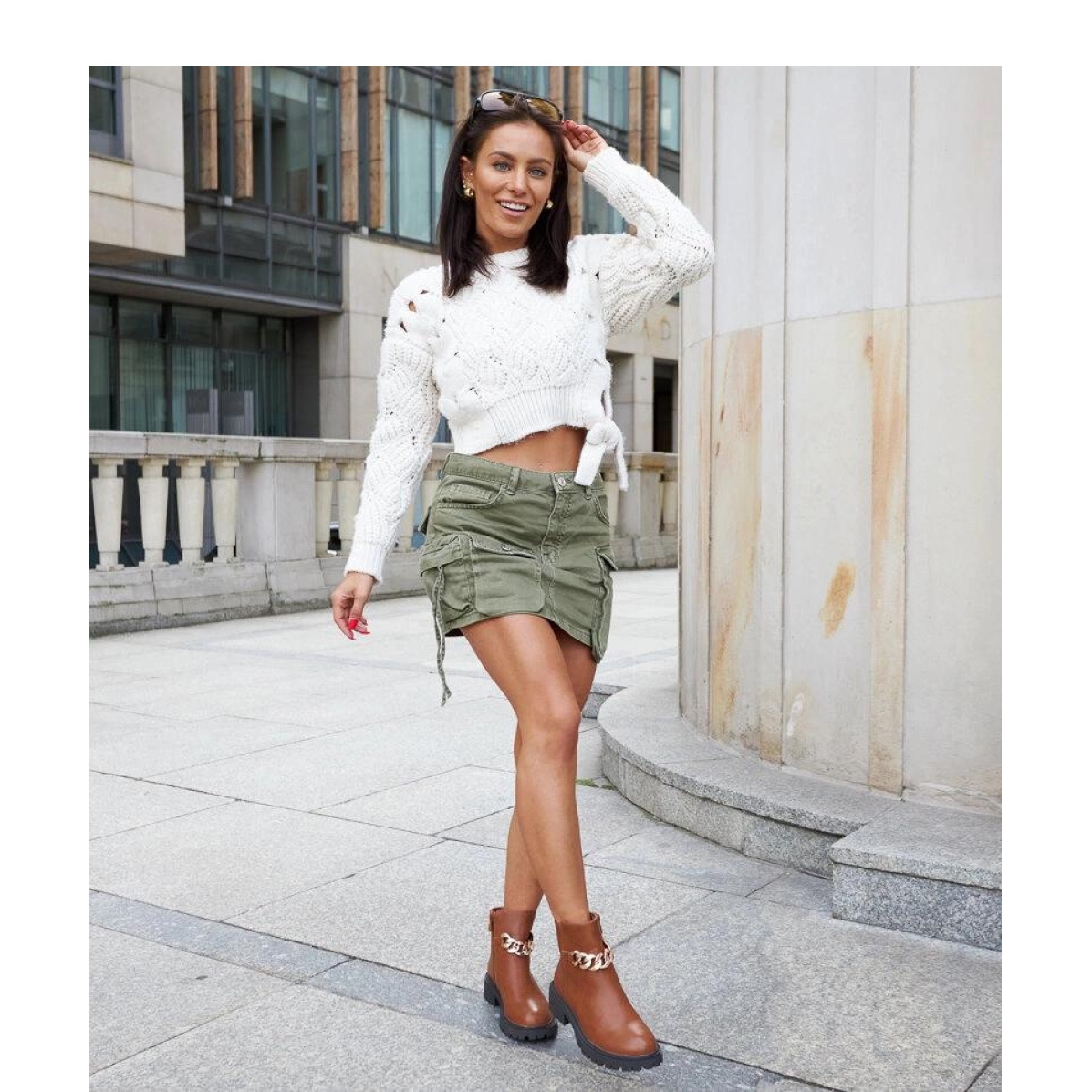 Saappaat ovat pyöreä nenä, joka lisää eleganssia ja hienovaraisuutta. Erityisesti koristeellinen ketju, joka on muodikas aksentti, herättää huomion, joka varmasti erottuu joukosta. Vakaa, litteä kantapää, jonka korkeus 3,5 cm, tarjoaa mukavuuden jokapäiväisessä käytössä, mikä mahdollistaa pitkät kävelyretket tuntematta epämukavuutta.