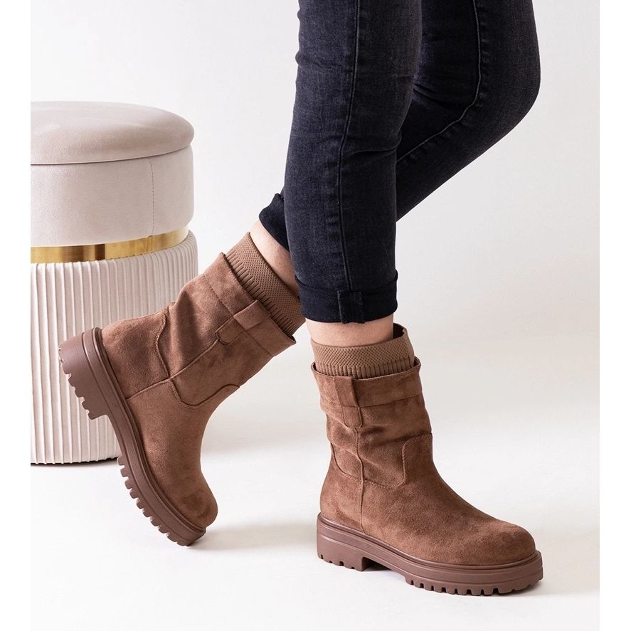 Saappaat ovat pyöreä nenä, mikä tekee niistä tyylikkäät ja universaalin. Ne on valmistettu ekologisesta mokkanahasta, joka korostaa edelleen heidän modernia luonnettaan. Ruskeat värit ja ruskea muovinen pohja sekoittuvat täydellisesti monilla talviasuilla.