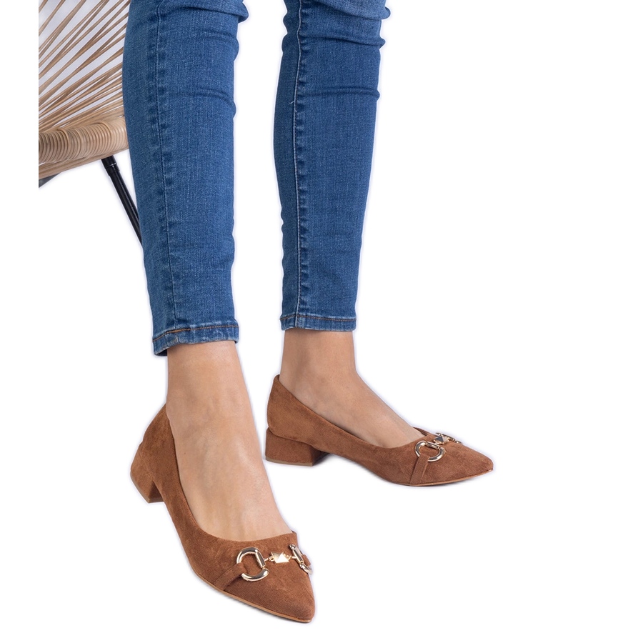 Yksityiskohdat: Ruskeat pumput Ekozamszista kultaisella sisustuksella