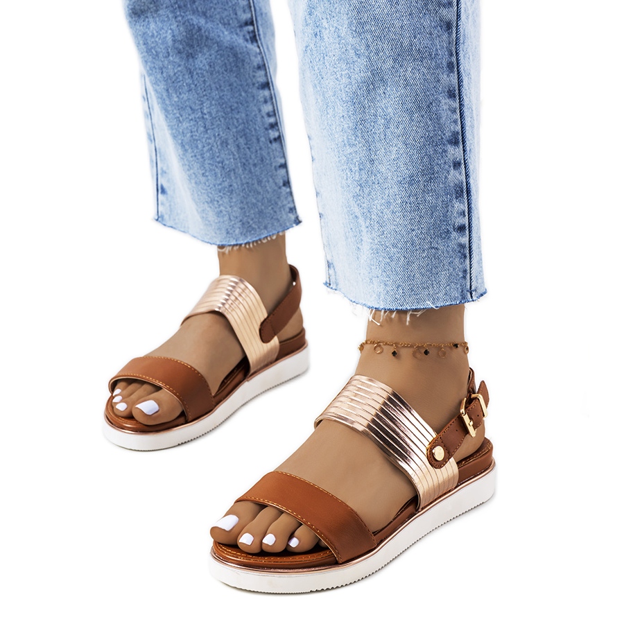 Yksityiskohdat: Ruskeat sandaalit, joissa metallinen Larochell-sisustus kultainen