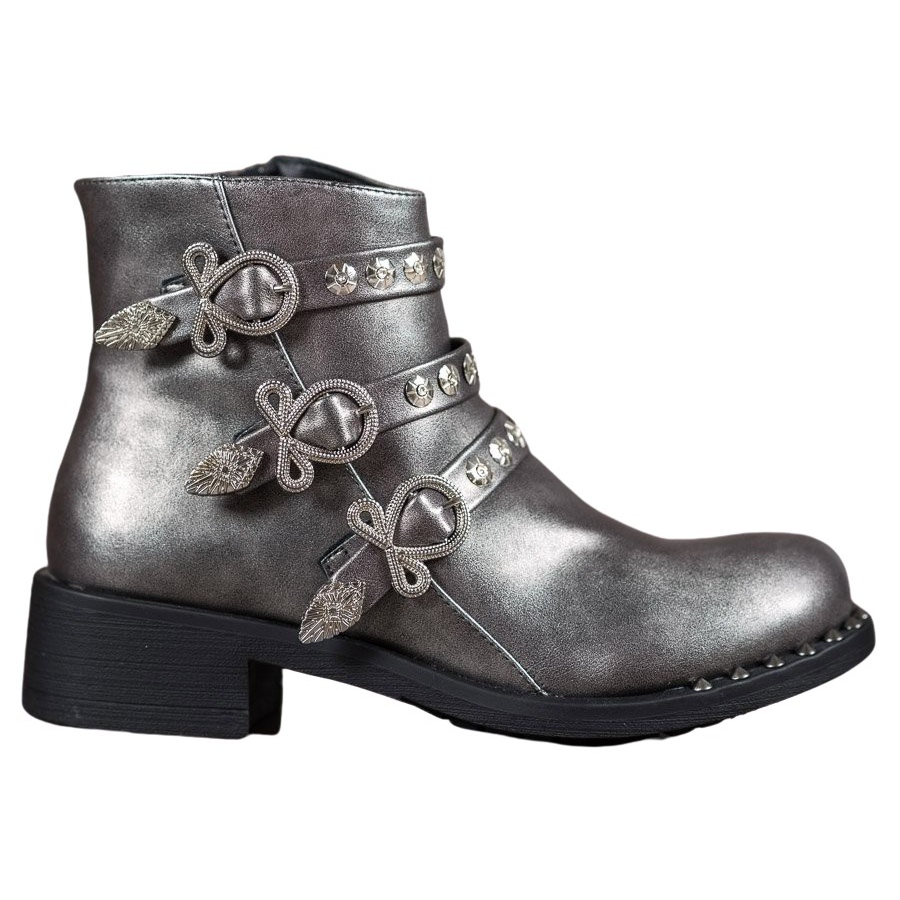 Esittelemme Forever Folie naisten nilkkurit muodikkaassa harmaan sävyssä, jotka varmasti herättävät tyylikkäiden ja alkuperäisten asusteiden ystävien huomion. Laadukkaasta ekologisesta nahasta valmistetut saappaat yhdistävät eleganssin ja aavistus rock-luonteen metallisten koriste-elementtien, kuten strassit ja hopeasoljet, ansiosta.
