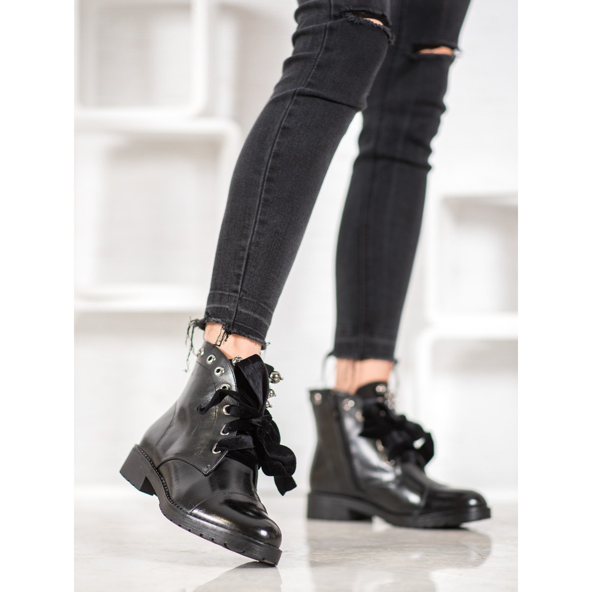 Synteettisten materiaalien ansiosta saappaat ovat helppohoitoisia, ja sisäinen eristys takaa mukavuuden myös kylmimpinä päivinä. Pitsikiinnitys ja vetoketju varmistavat täydellisen istuvuuden jalkaan, ja yläosan korkeus nilkan yläpuolella lisää tyylikkyyttä ja eleganssia.